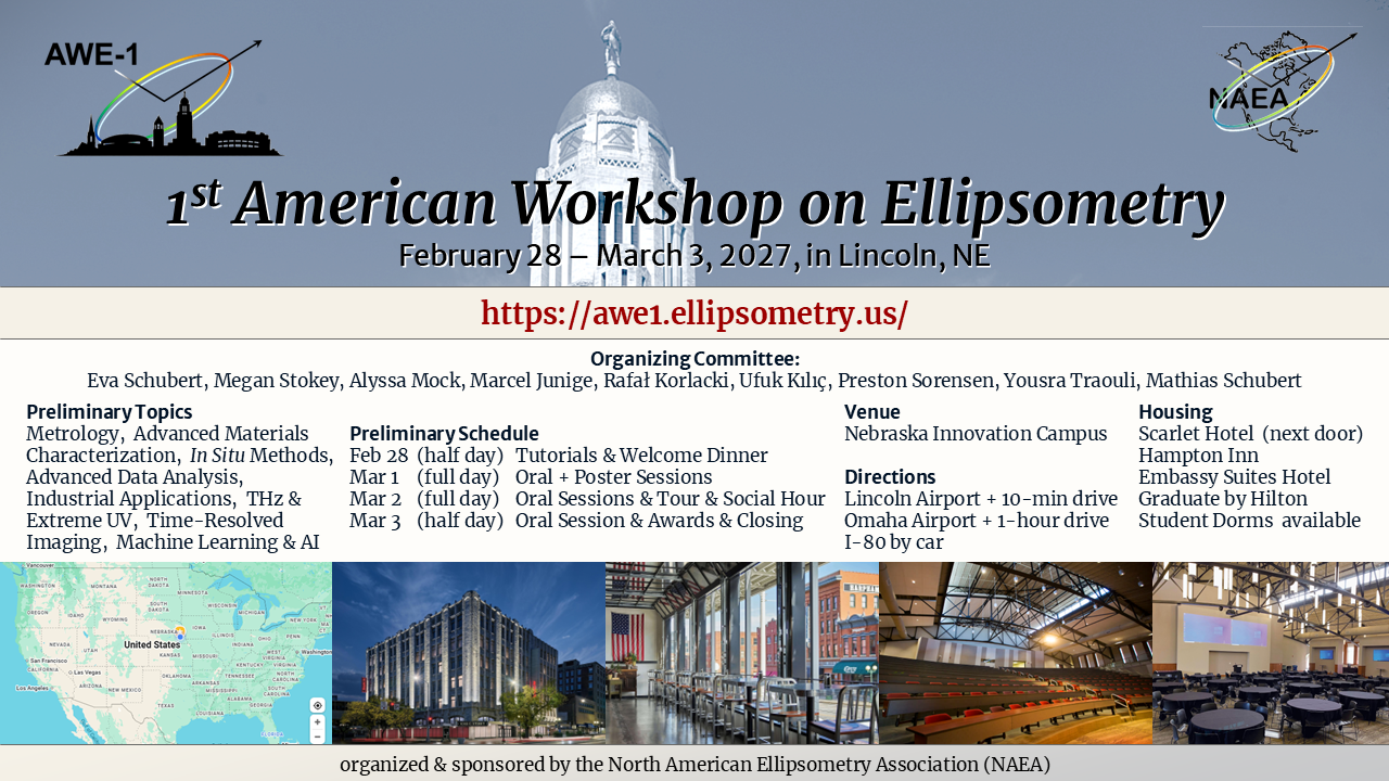 We look forward to welcoming you to the 1st American Workshop on Ellipsometry (AWE-1) to be held February 28 – March 3, 2027, in Lincoln, Nebraska. Lincoln offers a rich history of more than 100 years in the science and engineering of ellipsometry. The venue will be located on the Nebraska Innovation Campus.